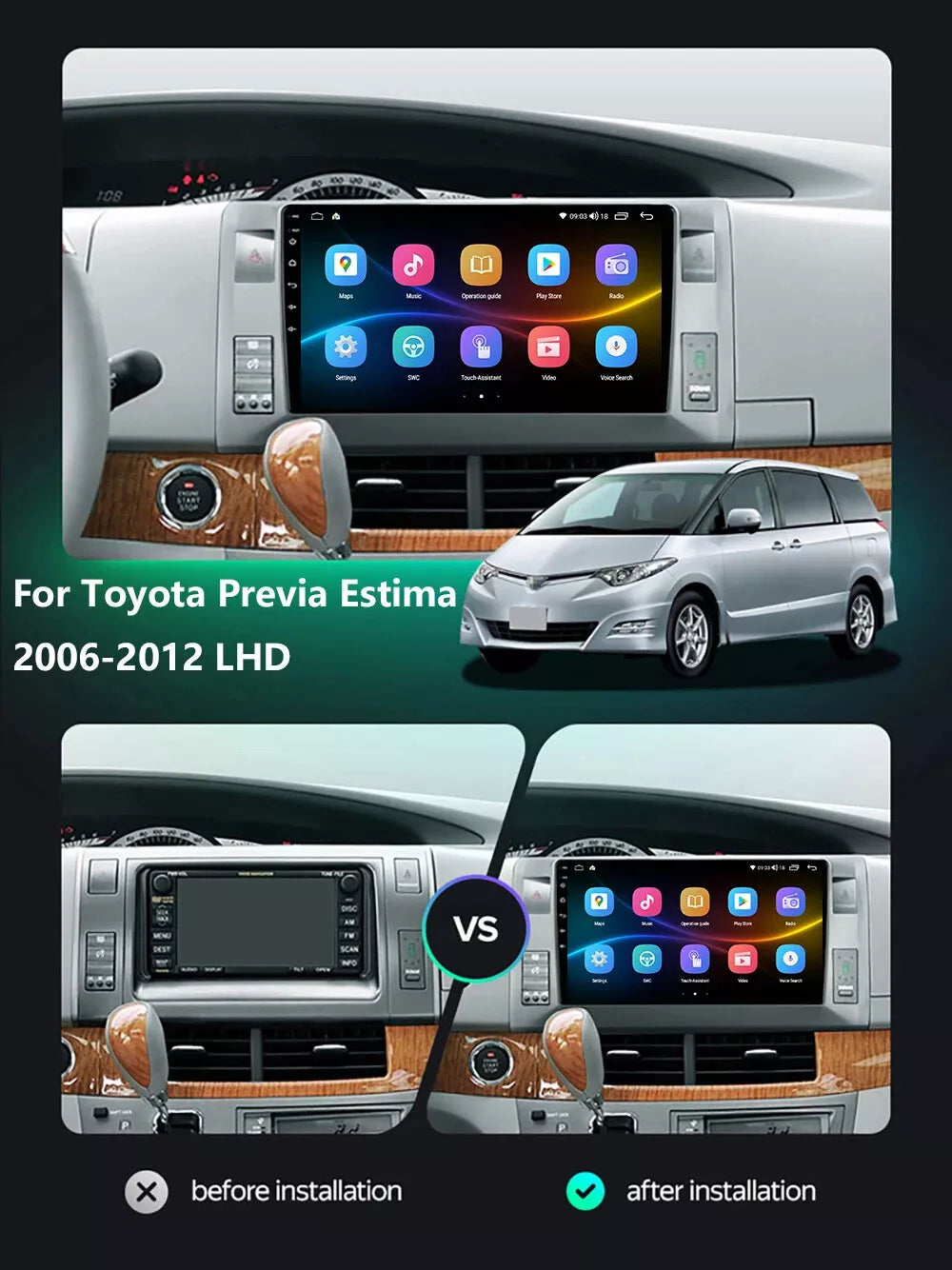 【Car Stereo Compatibility】 The 10.2 inch Android Car Stereo Radio Media For Toyota Previa XR50 3 III 2006 - 2019 Estima AHR20 XR50 3 III 2006 - 2016 LHD Head Unit. Plug & play, all necessary harness are provided, no need to cut the harness, easy to install. Support Backup Camera and 360° Panorama Camera and Steering Wheel Control. - 【Android 12 System and 2.5D Touchscreen】Toyota Previa car radio has excellent Android 12 system, 8GB RAM & 128GB ROM, allows operate smoothly, and enough for you to download the applications you want. And it covered with 9 inch 2.5D anti-scratch glass touchscreen, 1280*720/2000*1200 HD in dash touchscreen display, makes the auto radio looks particularly clear and elegant.