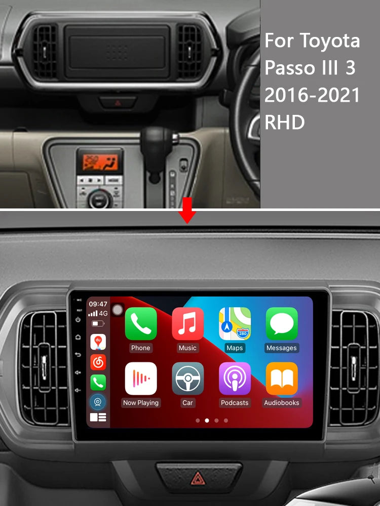 - 【Wired/Wireless CarPlay & Android Auto】Toyota Passo head unit support the latest IOS and Android systems, you can use Carplay/Android Auto through wireless or wired connection. Easily for you to wake up voice assistant and access your cell phone functions including music, video, GPS navigation, calls, notification, messages, watch movies, and more.