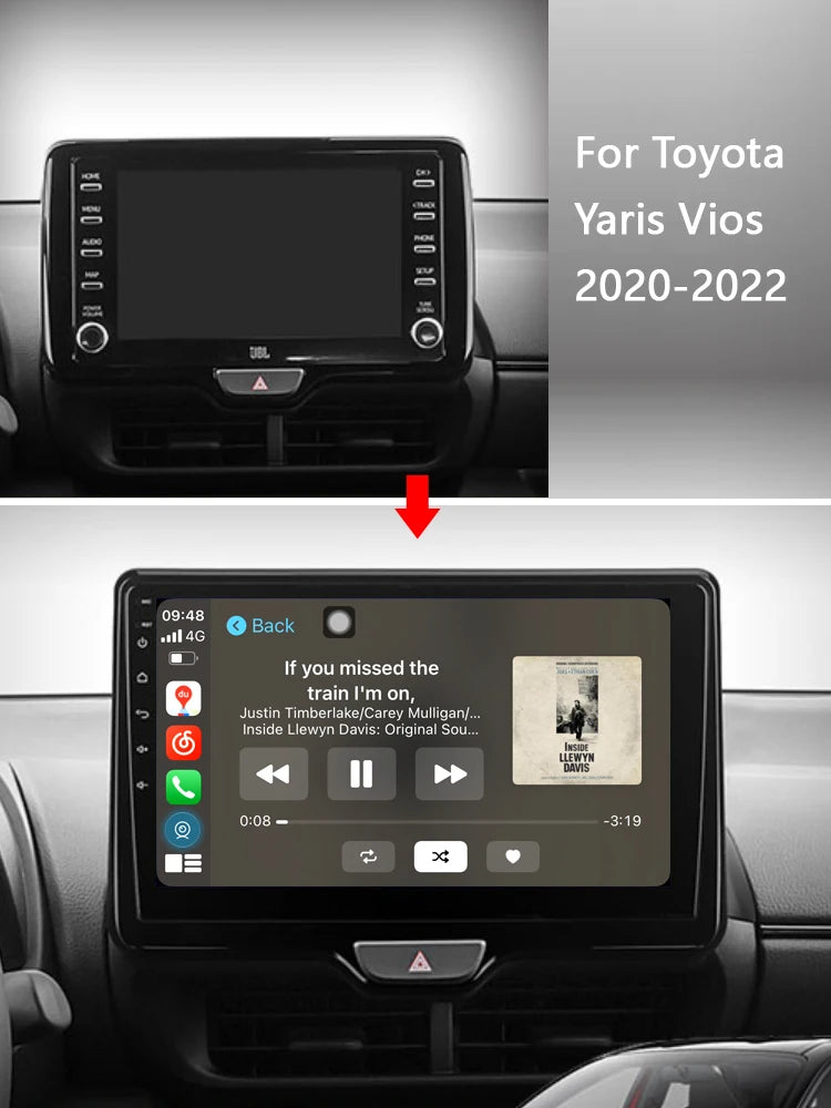 - 【Wired/Wireless CarPlay & Android Auto】Toyota Yaris Vios head unit support the latest IOS and Android systems, you can use Carplay/Android Auto through wireless or wired connection. Easily for you to wake up voice assistant and access your cell phone functions including music, video, GPS navigation, calls, notification, messages, watch movies, and more.